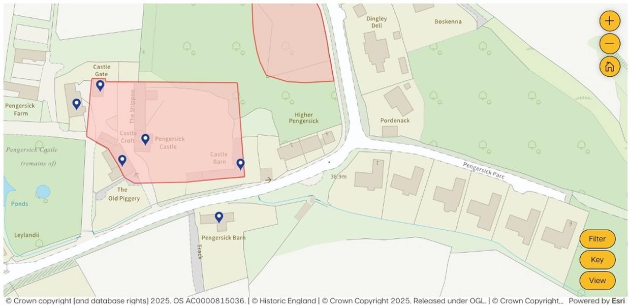 Here is the building today our property called “Smugglers Barn” which is a grade II listed property. The aerial view shows that the barn is not on the footprint of the Tower which stands on the site of Pengersick castle and if you look at the old maps and Listed buildings in Pengersick, our property is the only one outside the Tower ‘castle’ footprint as also confirmed from the Historic England Castle Footprint Map below. From the aerial view you can see the outline of the original castle courtyard by the position of the buildings and the road dividing it.